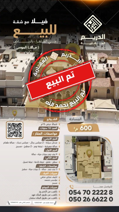 طلب اتصال | فيلا للبيع في حي الملقا | الدريم العقارية