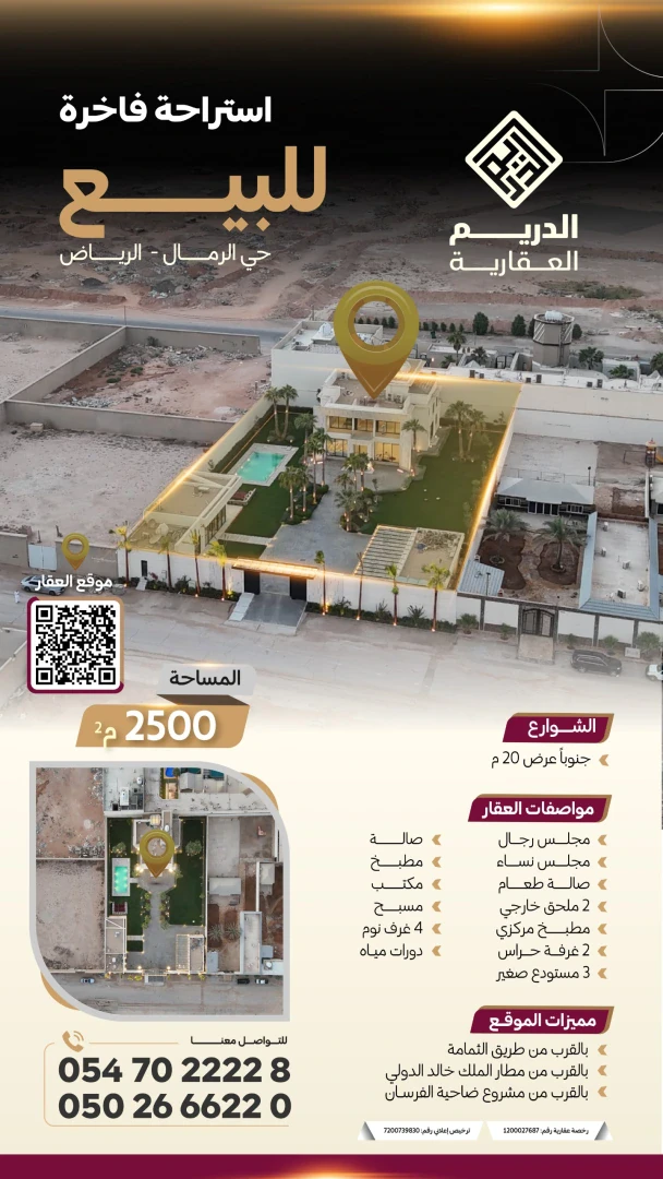 🛑للبيع: استراحة في حي الرمال بالرياض المساحة: 2500م الشارع: جنوباً عرض 20م مواصفات العقار: مجلس رجال مجلس نساء صالة صالة طعام مطبخ 4غرف نوم دورات مياة مكتب 2 ملحق خارجي مسبح مطبخ مركزي 2غرفة حراس 3 مستودع صغير