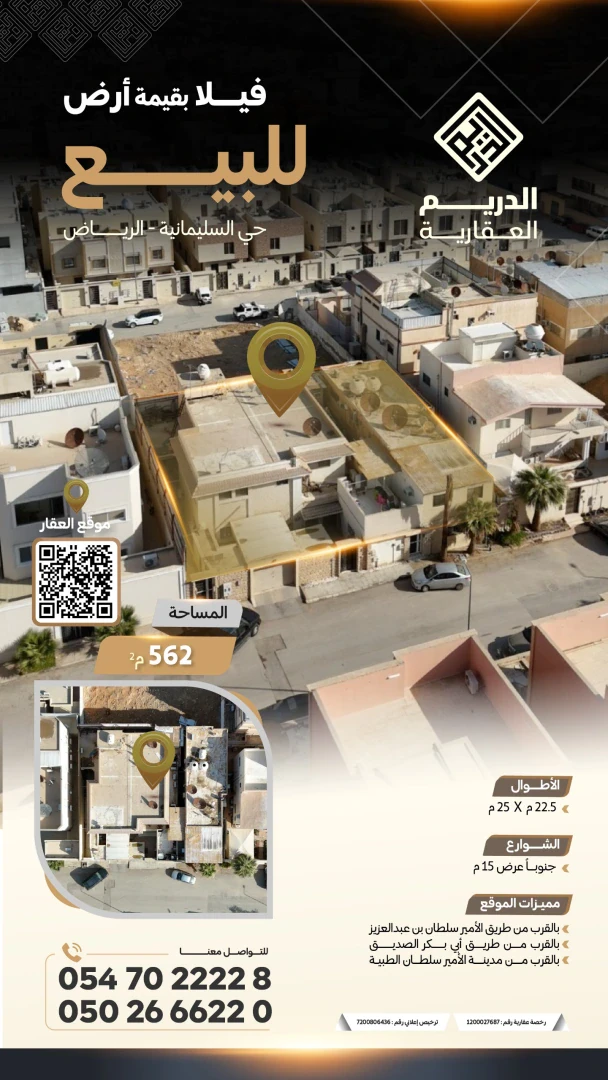 🛑للبيع: فيلا بقيمة ارض بحي السليمانية المساحة: 562م الاطوال: 25X22.5 الشوارع: جنوباً عرض 15م مميزات الموقع: بالقرب من طريق الامير سلطان بن عبدالعزيز بالقرب من طريق ابي بكر الصديق بالقرب من مدينة الامير سلطان الطبية